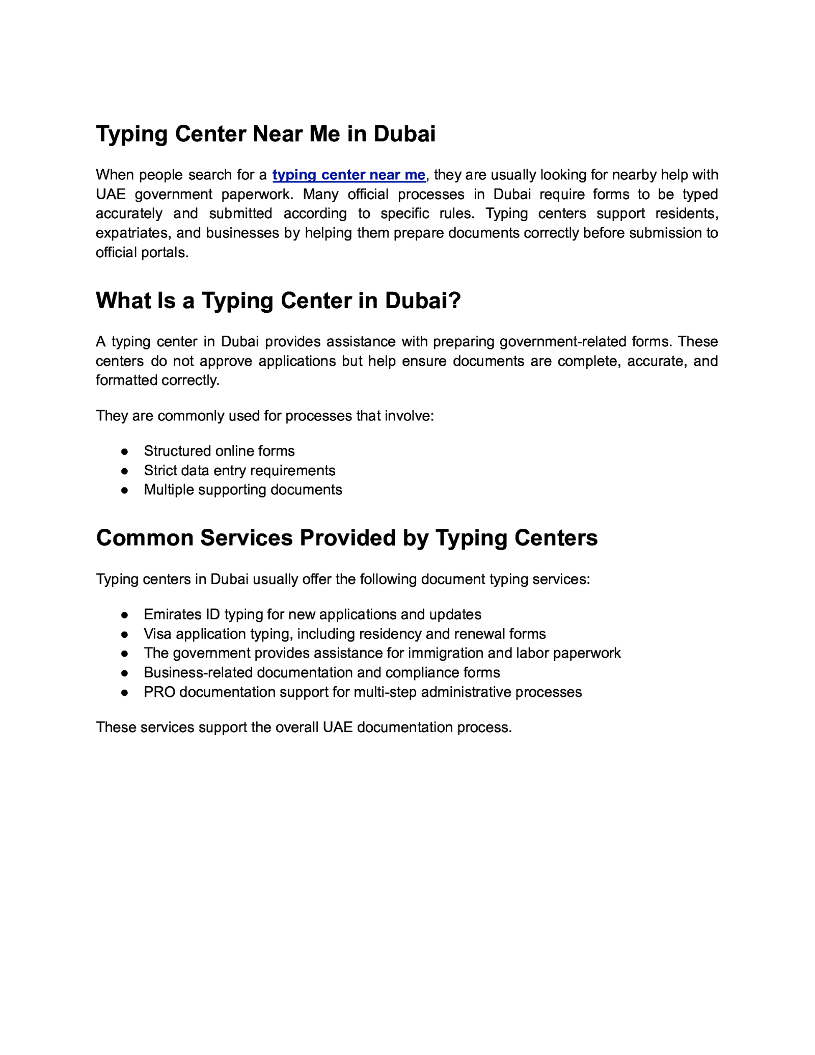 Typing Center Near Me in Dubai When people search for a typing center near me, they are usually looking for nearby help with UAE government paperwork. Many official processes in Dubai require forms to be typed accurately and submitted according to specific rules. Typing centers support residents, expatriates, and businesses by helping them prepare documents correctly before submission to official portals. What Is a Typing Center in Dubai? A typing center in Dubai provides assistance with preparing government-related forms. These centers do not approve applications but help ensure documents are complete, accurate, and formatted correctly. They are commonly used for processes that involve: ● Structured online forms ● Strict data entry requirements ● Multiple supporting documents Common Services Provided by Typing Centers Typing centers in Dubai usually offer the following document typing services: ● ● ● ● ● Emirates ID typing for new applications and updates Visa application typing, including residency and renewal forms The government provides assistance for immigration and labor paperwork Business-related documentation and compliance forms PRO documentation support for multi-step administrative processes These services support the overall UAE documentation process.
